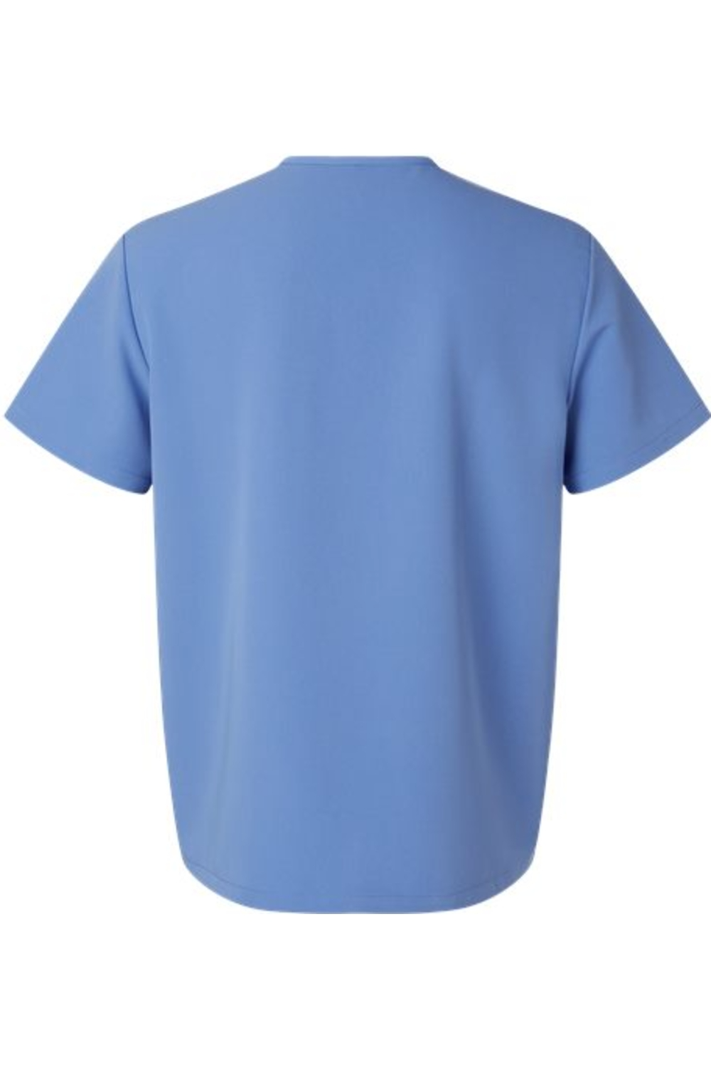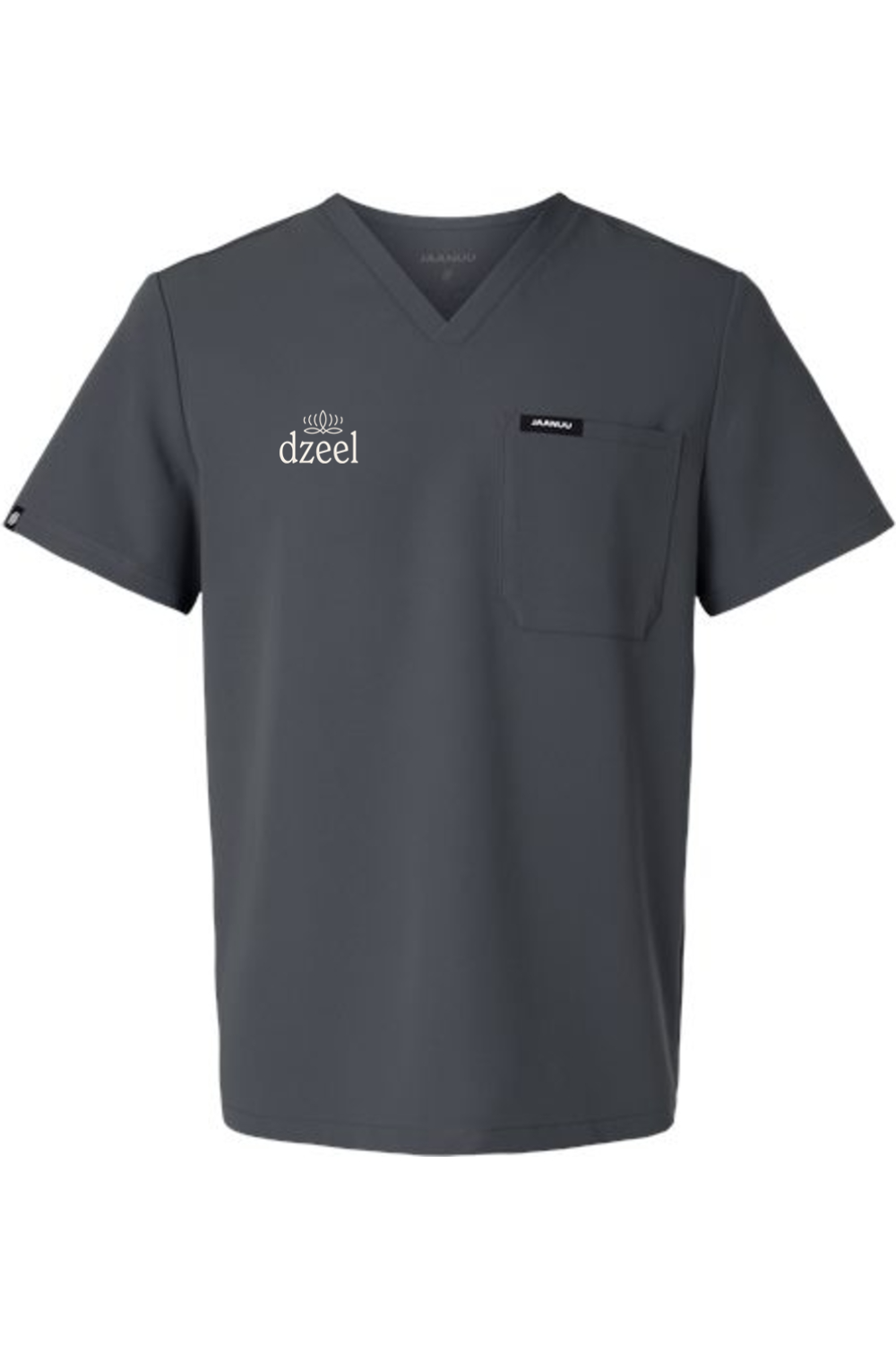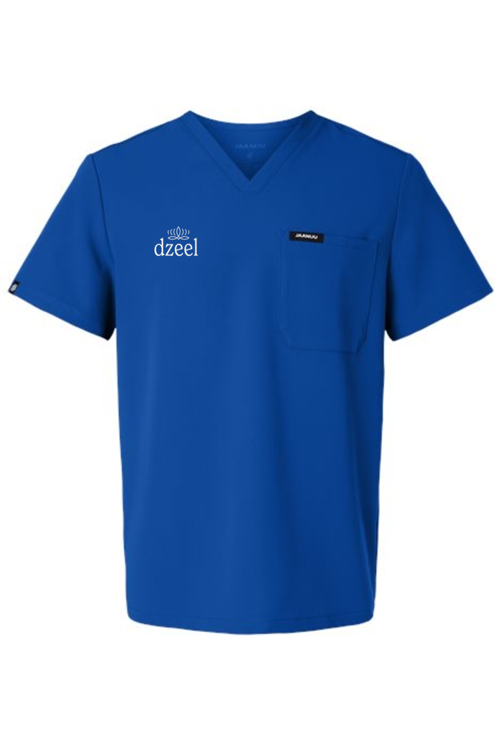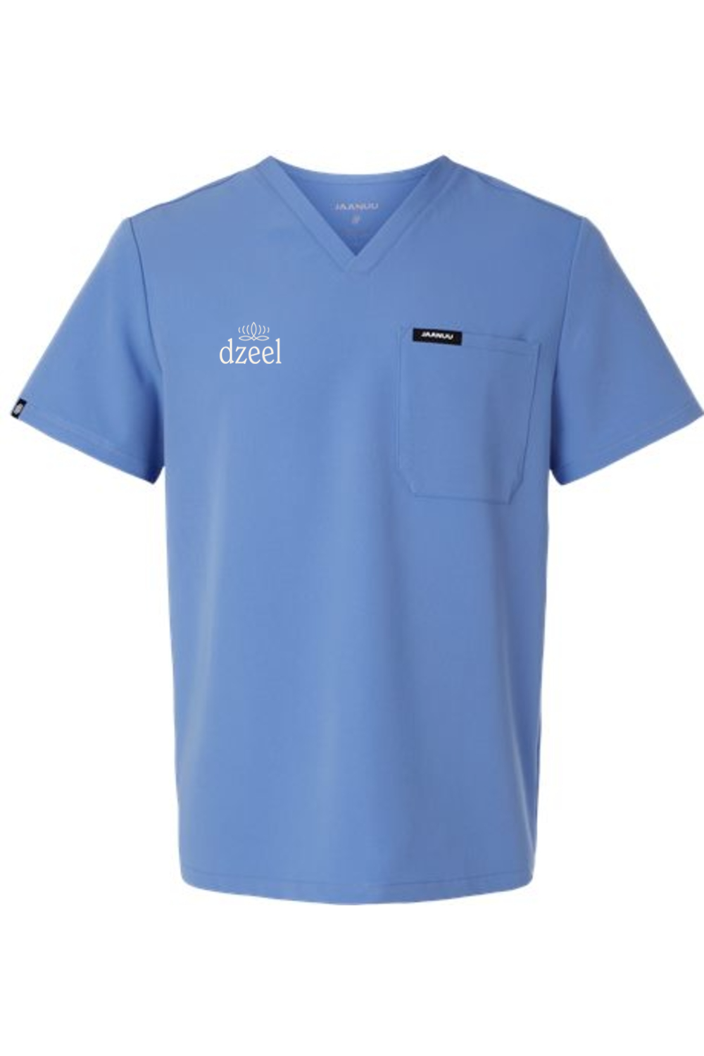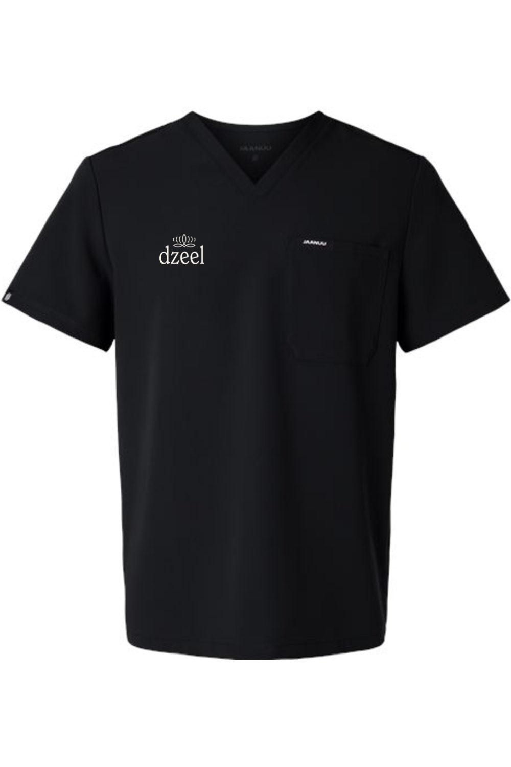 Experience the comfort and style of Jaanuu Holmes Everyday 1-Pocket Scrub V-Neck Top. Made with ULTRAlast™ and FUSEryx technology, this top offers a four-way stretch and is wrinkle, fade, and odor resistant. The tuckable design and soft brushed fabric provide all-day wearability. Featuring a left chest pocket and a DTF logo on the right chest, this top combines practicality and style.