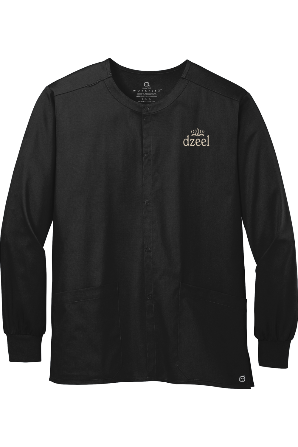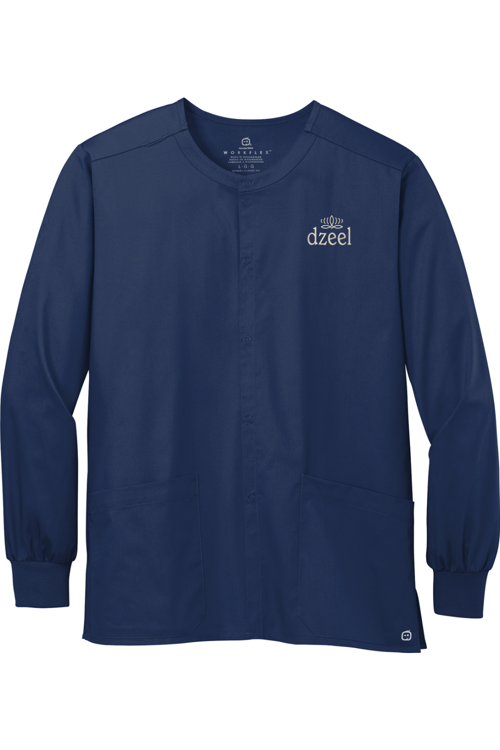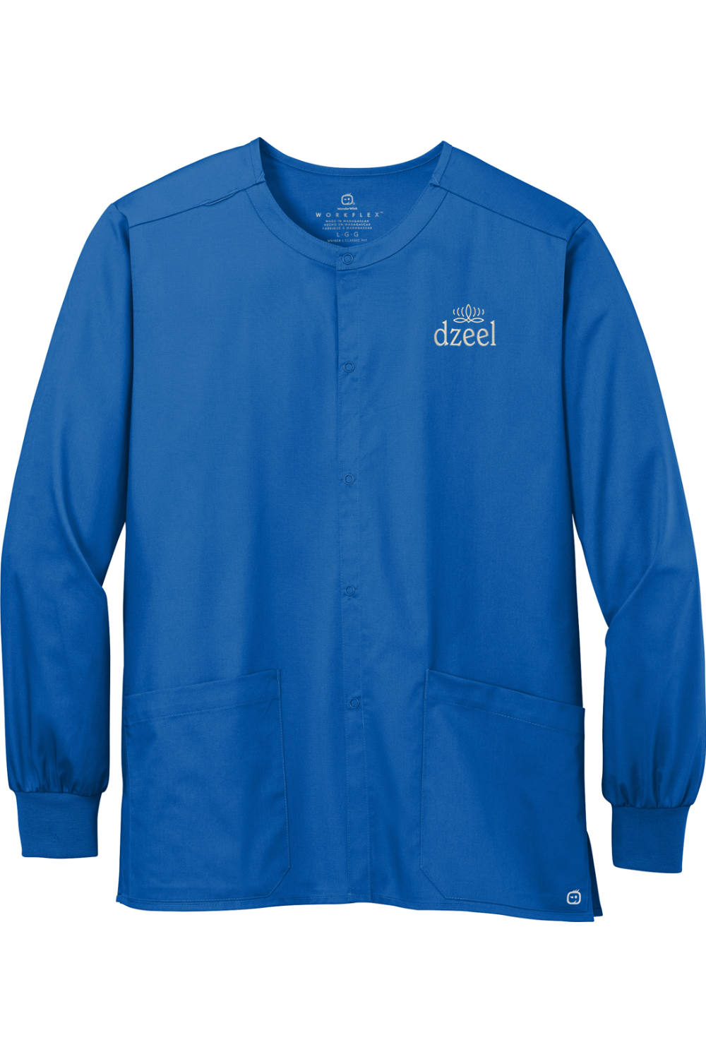 Experience ultimate comfort and style with the WonderWink Unisex WorkFlex Snap-Front Scrub Jacket. The mechanical stretch fabric allows for ease of movement while the 5-snap front closure adds a touch of functionality. The rib knit cuffs and side vents provide added comfort, while the shoulder badge loop and top-loading front pockets offer practicality. Stay warm with the Winkheat transfer logo and look effortlessly professional in the classic fit.
